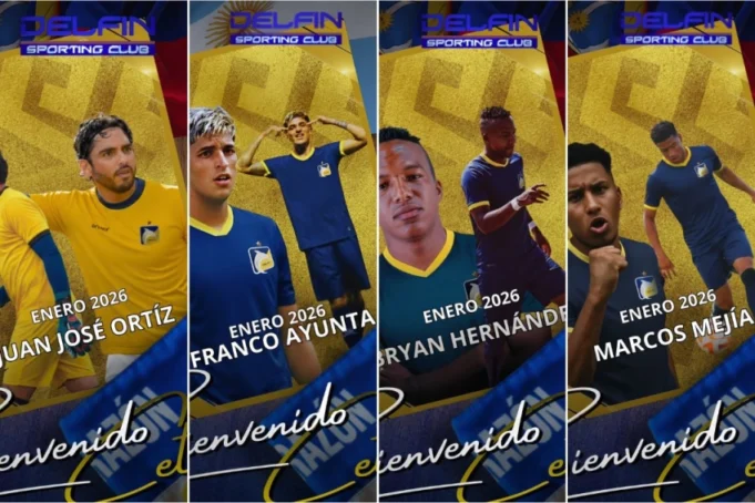 Delfín comienza a reforzarse para la temporada 2026 y la mañana de este viernes dio a conocer las contrataciones del portero Juan José Ortíz, del atacante argentino Franco Ayunta, del lateral Bryan Hernández y del extremo Marcos Mejía, para reforzar algunas de sus líneas.
