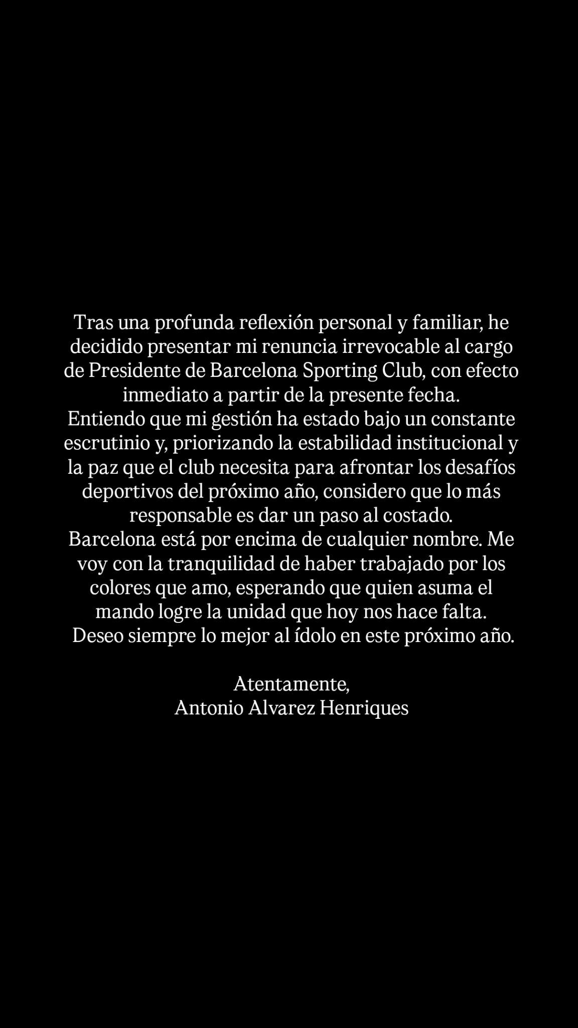 Con carta publicada en sus redes sociales, Álvarez dio a conocer su decisión: “Tras una profunda reflexión personal y familiar, he decidido presentar mi renuncia irrevocable al cargo de Presidente de Barcelona Sporting Club , con efecto inmediato a partir de la presente fecha”, comenzó la publicación.