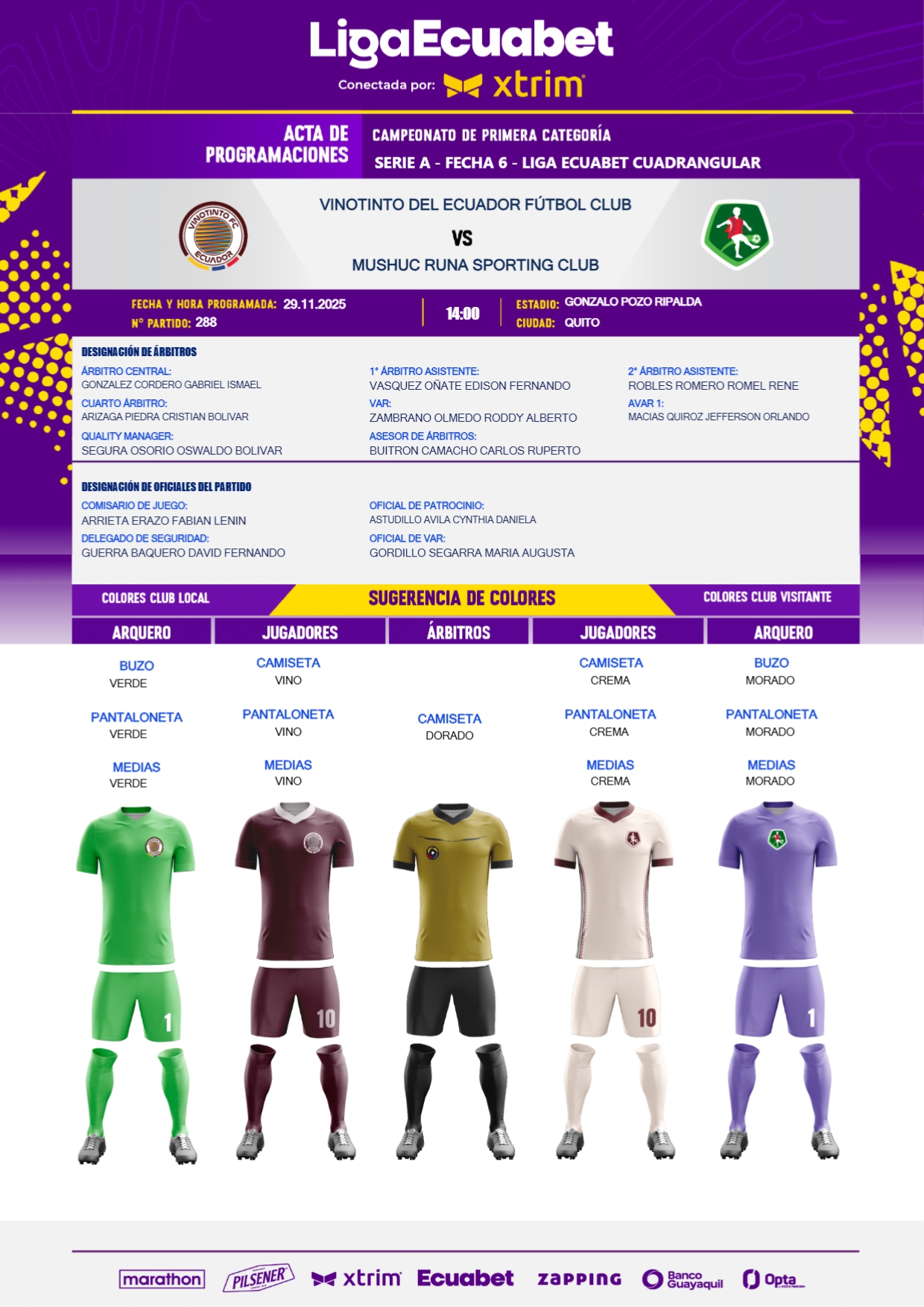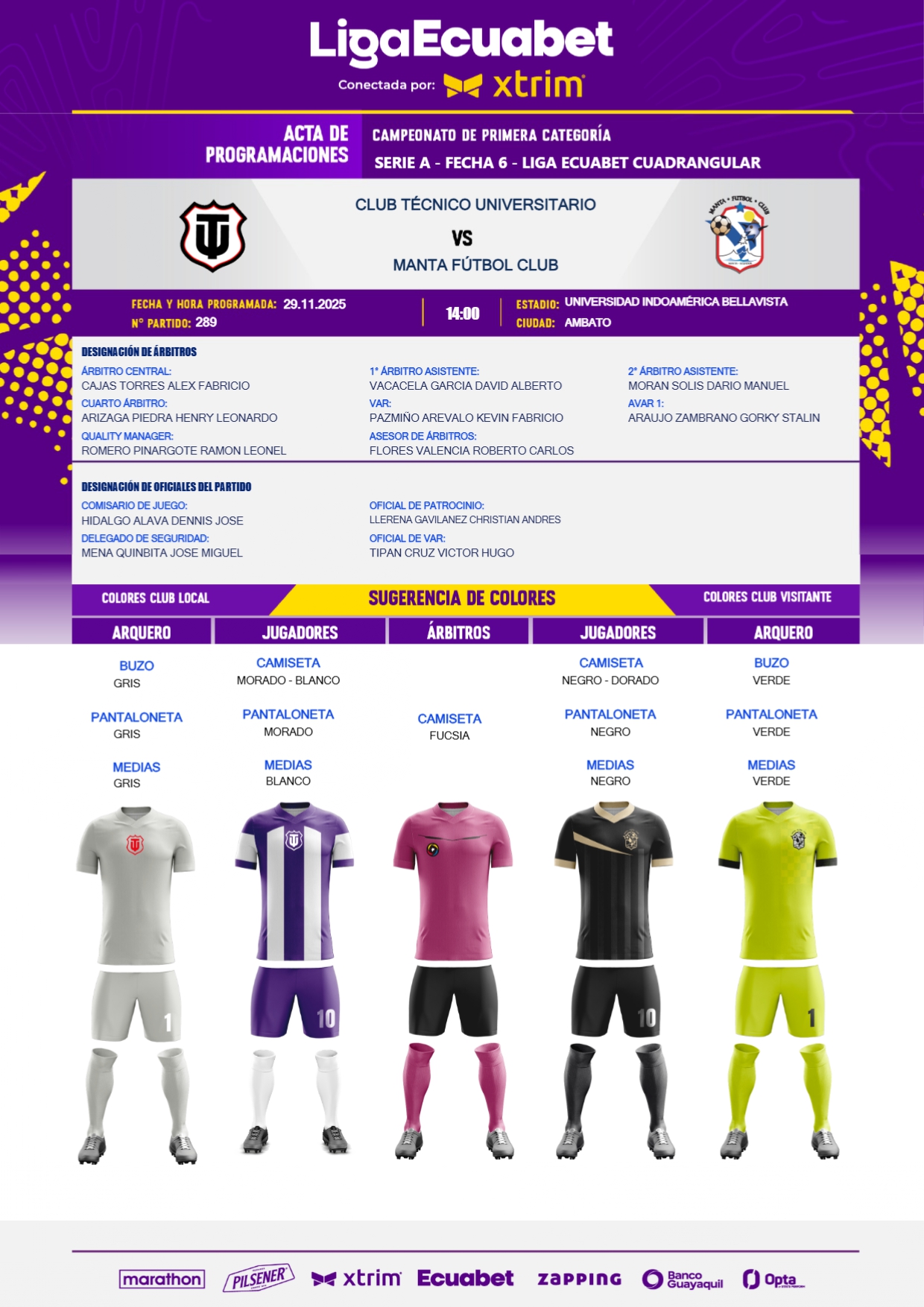 La jornada final del cuadrangular del descenso de la LigaPro se estará cumpliendo este sábado en Quito y Ambato y bajo el criterio de la unificación de horarios, se dieron a conocer detalles de la designación de los jueces para los encuentros que se cumplirán, mismos que detallamos a continuación.
