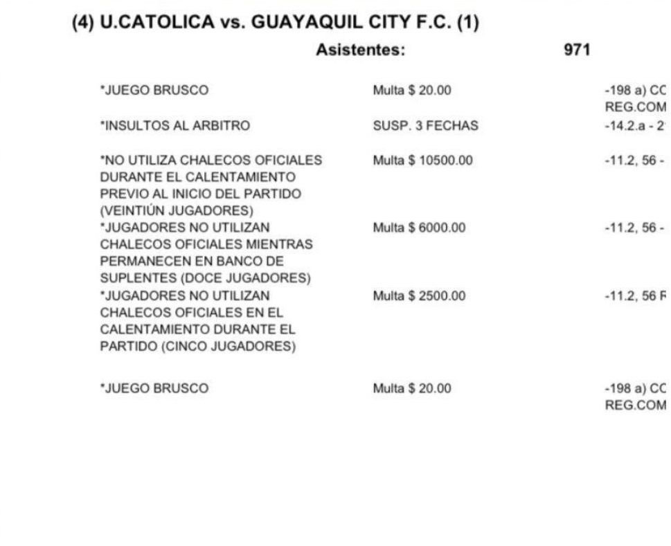 Liga Ecuabet publicó el acta de sanciones correspondiente a la fecha 8 del torneo nacional, donde Universidad Católica fue uno de los clubes más afectados con un total de $54.000 en multas por diversas infracciones reglamentarias.