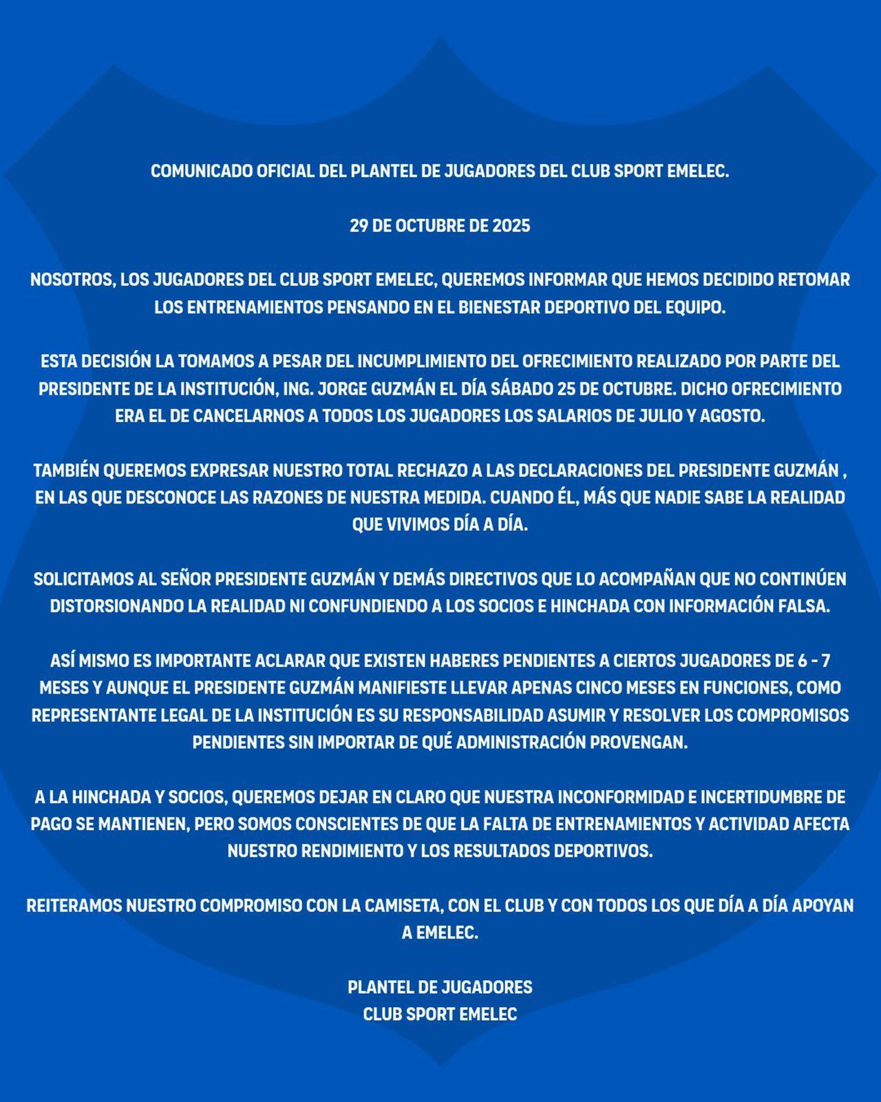 Además en la comunicación solicitan que tanto él, como el resto de los directivos dejen de engañar a la opinión pública con información falsa, ya que hay varios jugadores que no cobran entre 6 y 7 meses de salario, ratificando su compromiso con la camiseta azul.