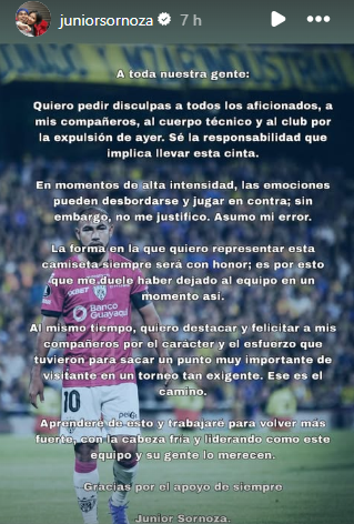 En una de sus historias de Instagram, Sornoza expresó sus disculpas por su próxima ausencia con Independiente del Valle en la CONMEBOL Libertadores: “Quiero pedir disculpas a todos los aficionados, a mis compañeros, al cuerpo técnico y al club por la expulsión de ayer”, comenzó su posteo.