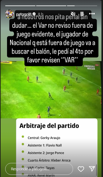 Tres imágenes publicadas en su cuenta de Instagram, dan cuenta de los errores arbitrales, en la primera donde una falta del jugador de El Nacional debió ser sancionada con expulsión y lanzamiento penal en favor de Delfín, pero en la misma no hubo auxilio del ‘VAR’.