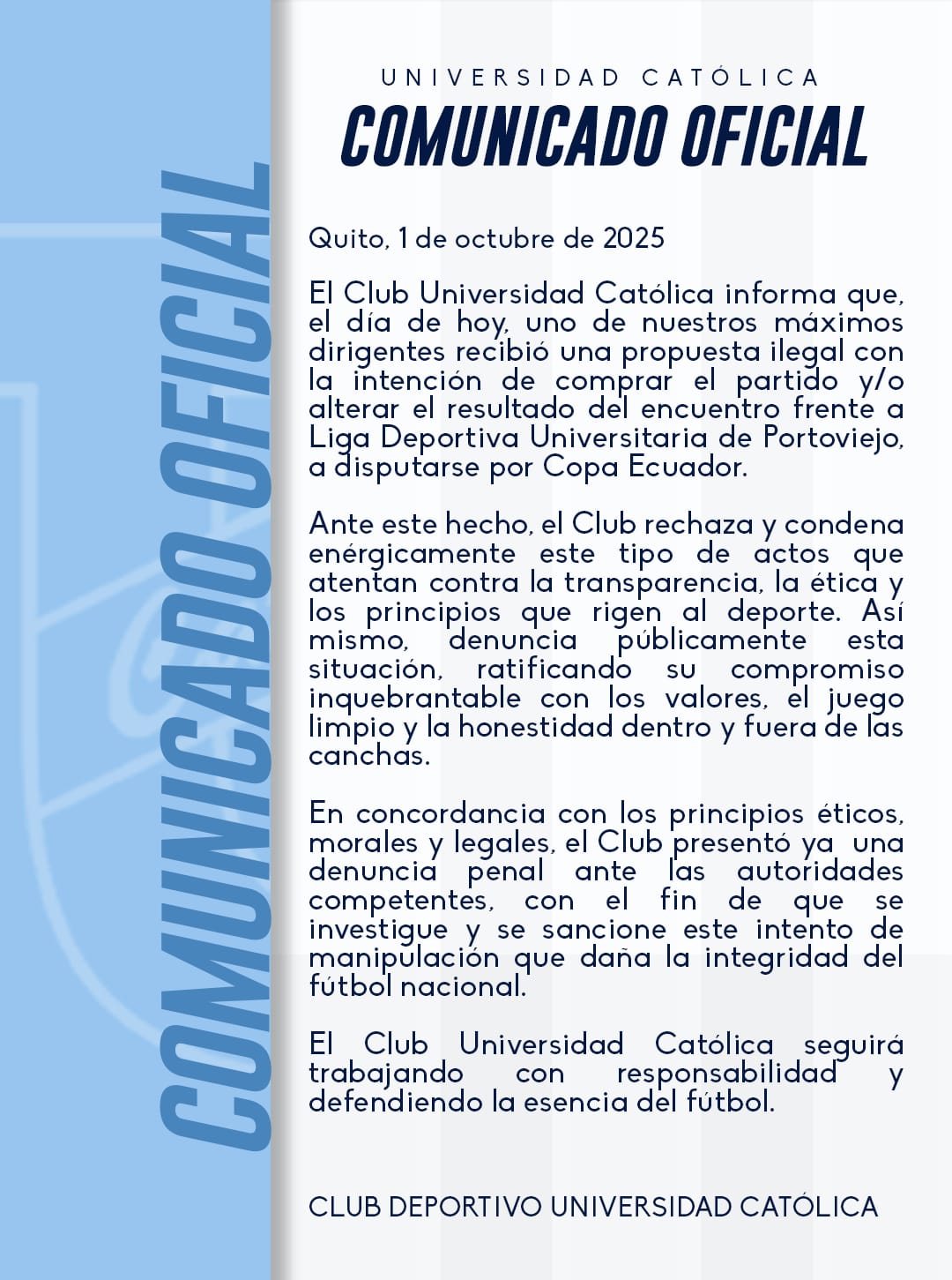 A través de un comunicado oficial, la Universidad Católica dio a conocer que esta mañana uno de sus máximos dirigentes recibió un mensaje de un número desconocido con la propuesta en mención, ante lo cual se negó, procediendo como club en colocar la denuncia respectiva ante las autoridades de la Fiscalía.